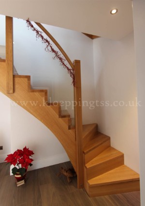 Key features include: •Quarter turn staircases with winder steps •Cut stringers •European oak •Solid hardwood stringers, steps, risers, handrail and newel posts •'Folded effect' risers that sit flush with front edge of the treads •Side mounted newel posts •One newel post has a decorative grooved cap •Rounded handrail •Slotted glass infill panel balustrade •Glass shaped to match steps |