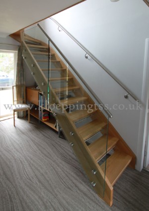This marriage of traditional style support stringers and modern frameless glass balustrade and handrails make for a staircase with an open, spacious feel. Key features include: •Quarter turn staircase with winder steps •Solid European oak stringers and treads •Open risers with brushed stainless steel child safety bars •Frameless toughened and laminated glass balustrade •Round glass clamps in brushed stainless steel •Round brushed stainless steel handrail mounted on top of glass, and matching wall handrail |