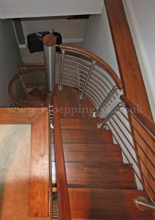 Key features include: •Double half spiral staircase with treads in American walnut •Open risers with brushed stainless steel child safety bars •Central column in brushed stainless steel •Outer balustrade with newel posts, connecting bolts and rails in brushed stainless steel •Round section American walnut handrail •Landing balustrade with toughened glass infill panel and American walnut base rail •Multiple mid-staircase landings, and direction change to straight run towards top of stairs. |