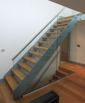 Key features include: •Straight run staircase •Powder-coated mild steel stringers •Solid European oak treads •Open risers with brushed stainless steel child safety bars •Frameless toughened and laminated glass balustrade •Balustrade glass extends down to down to floor level and sits in a brushed stainless steel base channel •Round glass clamps in brushed stainless steel •Round brushed stainless steel handrail mounted on top of glass |