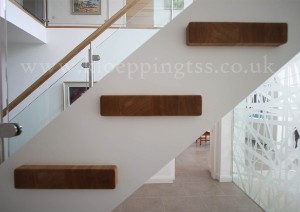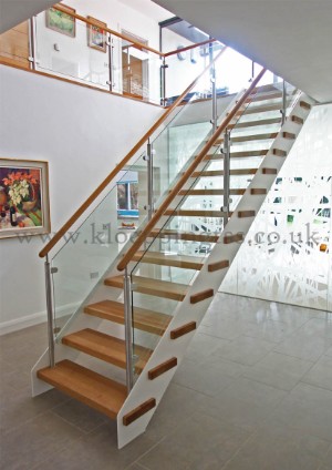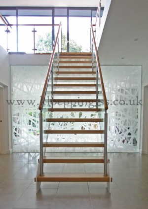Positioned within a large hallway, directly infront of a decorative glass feature wall, this steel stringer staircase acts to optimise and enhance the design and aesthetics of the property. A minimal cross section and open risers go a long way to optimising the level of vision, all the way through to the garden beyond. With colours and materials chosen to extend those used in the home, the stairs fits neatly into the surrounding decor. Decorative capping designed to give the illusion of protruding steps, and the use of stainless steel posts give the stairs that extra bit of character, finding just the right balance between minimalism and contemporary flair. Key features include: •Powder-coated mild steel stringers •Solid European oak treads •Open risers •Round brushed stainless steel newel posts •D-clamped glass infill panel balustrade •Round European oak handrails mounted above the newel posts •Protruding step effect capping |