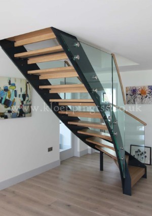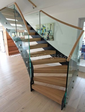 Key features include: •Quarter turn staircase with winder steps •Powder-coated mild steel stringers •Powder-coated support post in corner •Solid European oak treads with folded nosing at front edge •Open risers •Frameless toughened and laminated glass balustrade on both sides •Round glass clamps in brushed stainless steel •Round section hardwood handrail, mounted on top of glass on both sides |