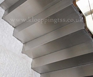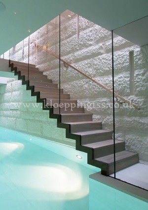 Key features include: •Straight run staircase (directly above indoor swimming pool) •Marine grade stainless steel stepped stringers on open side, with decorative PVD coated cladding •Semi-cantilevered steps and risers •Custom finish solid oak treads •'Folded effect' risers that sit flush with front edge of the treads •Underside of staircase clad in marine grade brushed stainless steel plates •Glass wall extending up from the staircase, sealed directly into the steps |
