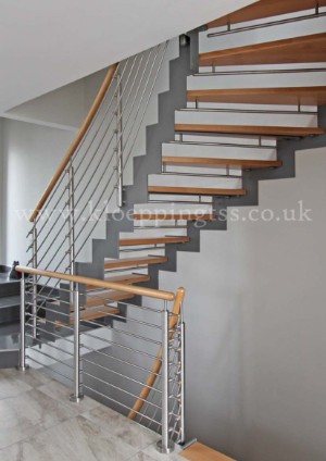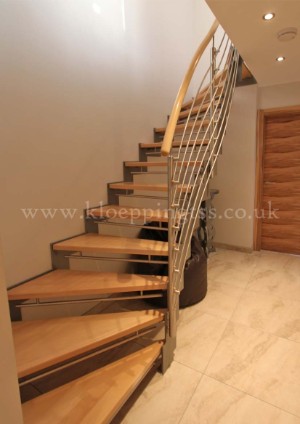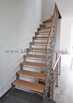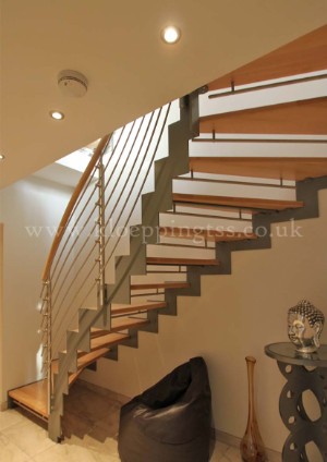 Key features include: •Quarter and half turn staircases with winder steps •Powder-coated stepped steel stringers •Solid European oak treads •Open risers with brushed stainless steel child safety bars •Inner balustrade with newel posts and rails in brushed stainless steel •Newel posts side mounted to stringers •Round section European oak handrail |